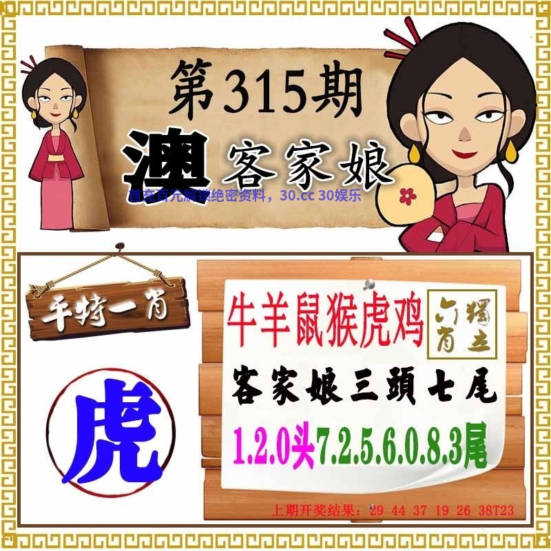 | 315期:客家娘心水 315期:【客家娘平特一肖】虎虎虎 315期:【客家娘必中六肖】牛羊鼠猴虎鸡 315期:【客家娘三头七尾】012头-6087253尾 |